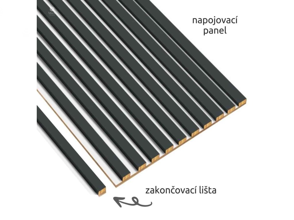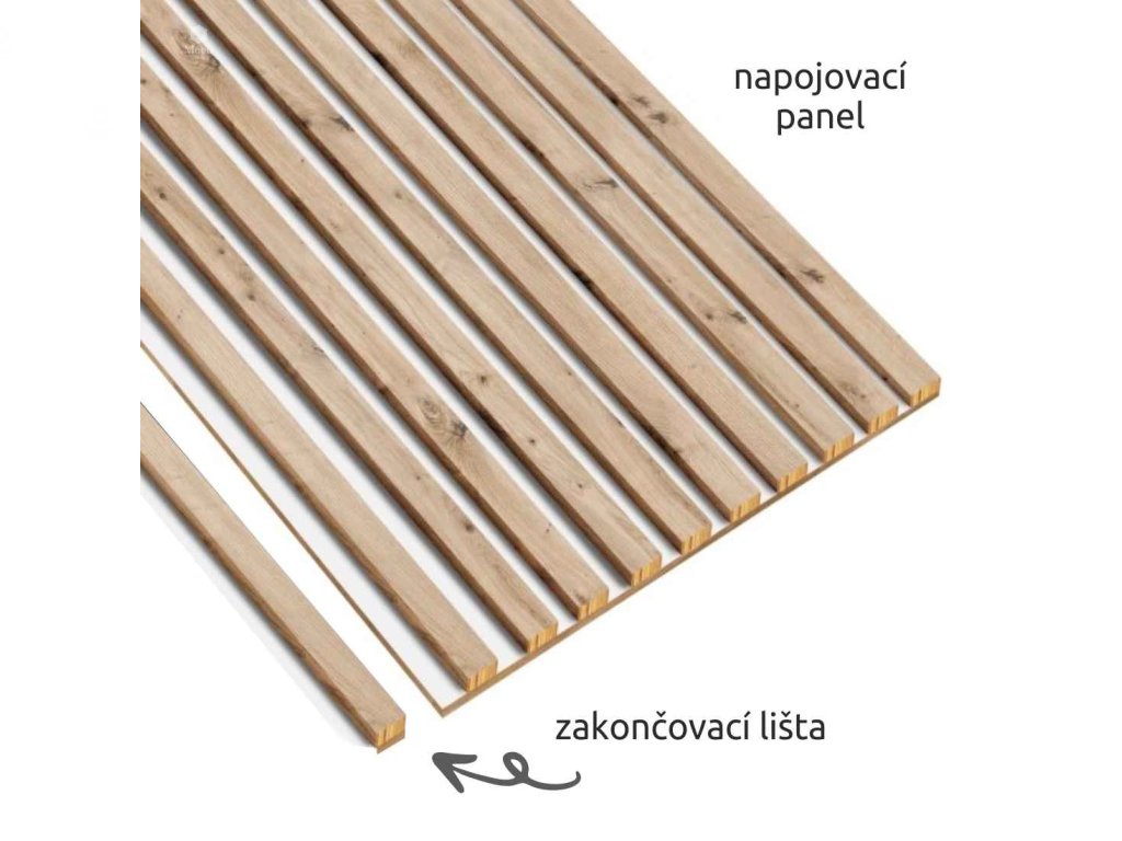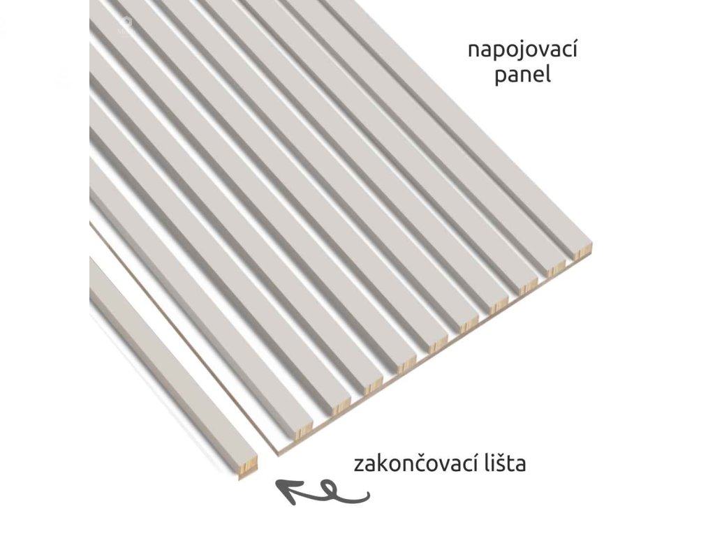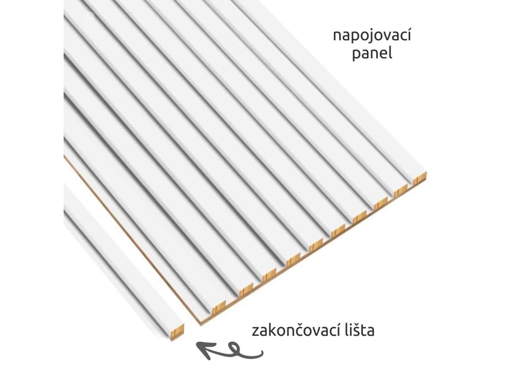 Napojovací panel – jedna strana začíná lamelou a druhá končí bílou deskou, což umožňuje snadné napojení modulů do celistvé stěny bez viditelných přechodů. Rozměr: 51,3 cm × 280 cm. Pozor - pro dosažení čistého a pohledově dokonalého zakončení je nutné počítat se zkrácením lamel z obou stran.
