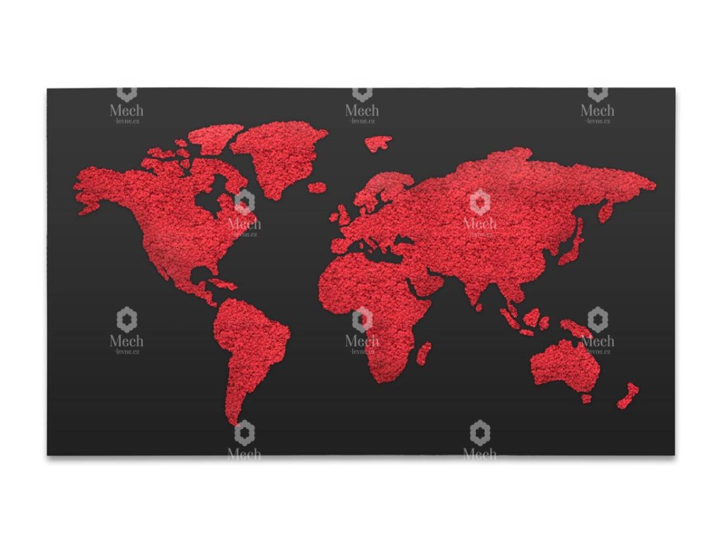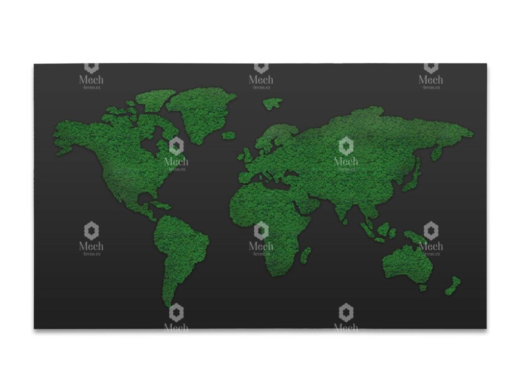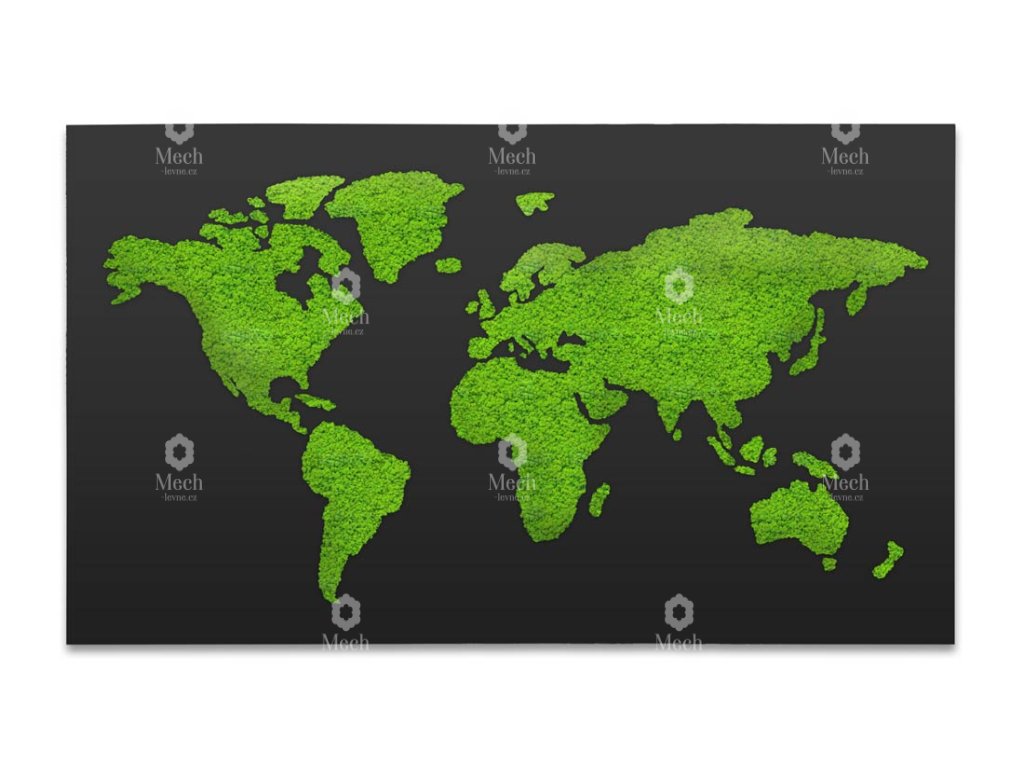 Zářivá mechová mapa světa z prémiového finského mechu (lišejníku) a černého, matného podkladu se hodí do každého interiéru.  Stabilizovaný mech se hodí do každého interiéru, kde navodí příjemnou a uklidňující atmosféru. Benefitem je jeho bezúdržbovost a stálozelená barva.