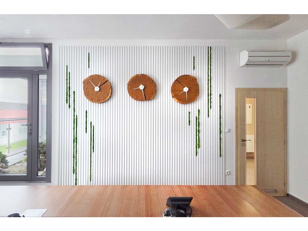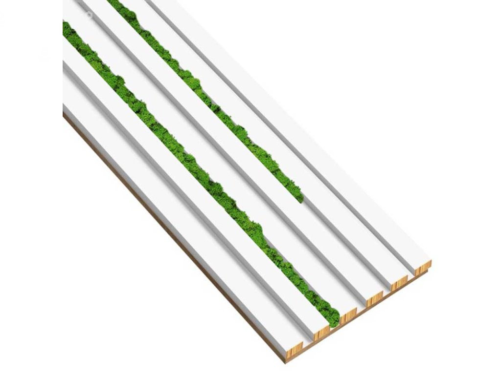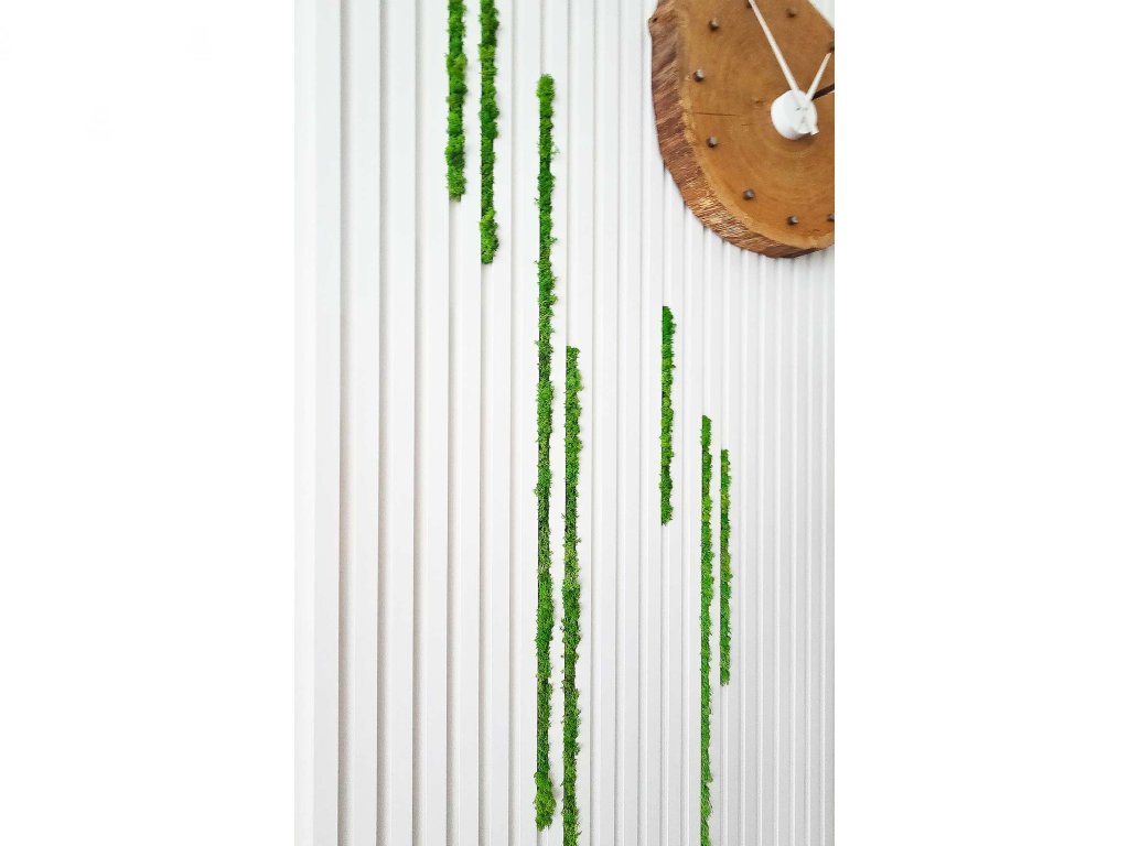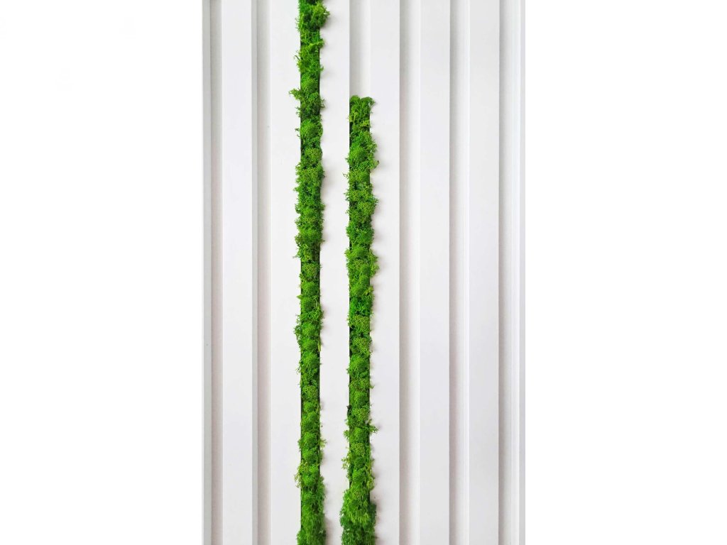 Mechové pásy jsou navrženy jako doplněk k akustickým lamelovým panelům. Jedná se o tenké pásy o šířce 1,5 cm, osazené svěžím jasně zeleným sobím mechem (lišejníkem), které se jednoduše vkládají do mezer mezi lamely. Výsledkem je výraznější designový efekt a zároveň lepší akustický komfort v prostoru.